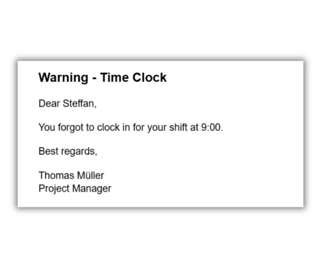 With workflows, you can automate your control and business processes. For example, employees can be notified to log their hours or clock out on time to avoid unnecessary overtime.