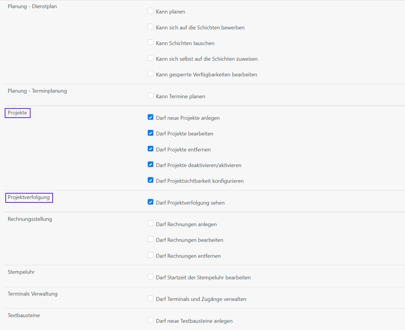 Um einzustellen, welche Projekte ein/e Benutzer:in einsehen, bearbeiten oder verwenden kann, gehen Sie auf Datenverwaltung > Benutzer und klicken Sie auf den/die gewünschte/n Benutzer:in. Klicken Sie anschließend bei den Benutzerrechten auf “Einstellungen anzeigen”. Scrollen Sie hinunter zu der Sektion “Projekte” und wählen Sie die entsprechenden Berechtigungen aus.