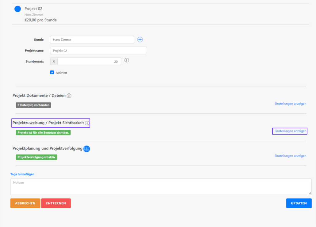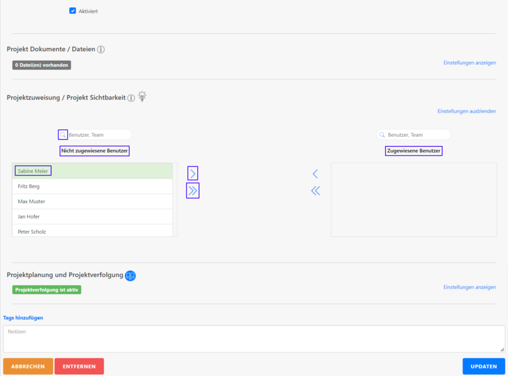 Die Zuweisung von Mitarbeitern bzw. Mitarbeiterinnen zu Projekten ist sehr vorteilhaft. Zum einen können Sie “versteckte” Projekte anlegen, welche nur von bestimmten Benutzern bzw. Benutzerinnen eingesehen werden können. Außerdem haben Sie die volle Kontrolle über die Sichtbarkeit der Projekte.