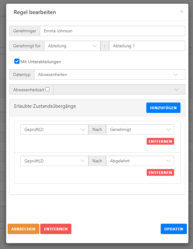 Um zu definieren, wer als Erstprüfer, als Zweitprüfer und als Genehmiger gilt, gehen Sie zu Genehmigungen. Dort können Genehmigungsregeln erstellt werden. Anhand der Genehmigungsregeln legen Sie fest, wer Abwesenheitsanträge genehmigen darf und welchen Status dabei ausgewählt werden kann.