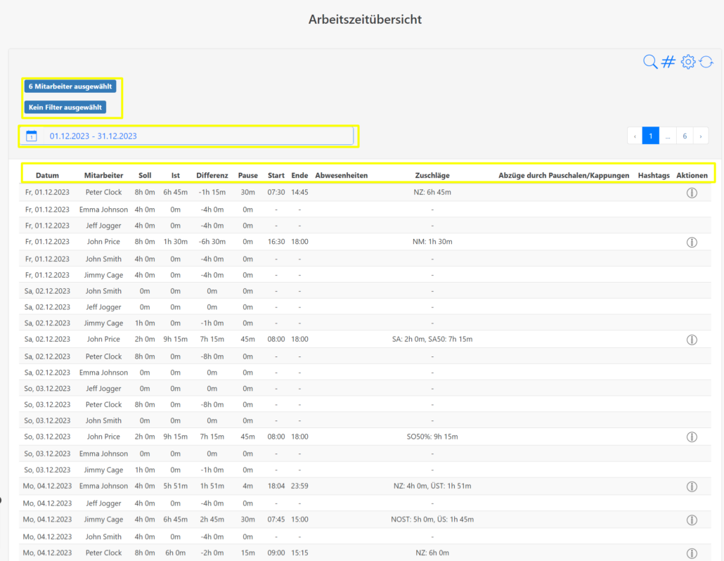 Standardmäßig sind alle Spalten auf einmal angezeigt und beinhalten Informationen über Datum, Mitarbeiter, Soll-, Ist- und Saldostunden, Pause, Start- und Endzeit, Zuschläge, Abzüge durch Pauschalen/Kappungen und Hashtags. Zusätzlich können Sie in der letzten Aktionen-Spalte mit einem Klick zu Anwesenheits- oder Zeiteinträgen gelangen und diese bei Bedarf bearbeiten.