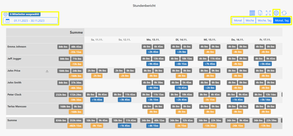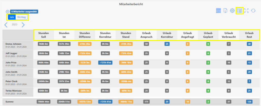 Der Mitarbeiterbericht ist eine Kombination aus Stunden- und Urlaubsübersicht, die Ihnen ermöglicht, alle Stunden- und Urlaubsdaten von allen MitarbeiterInnen auf einmal zu sehen.