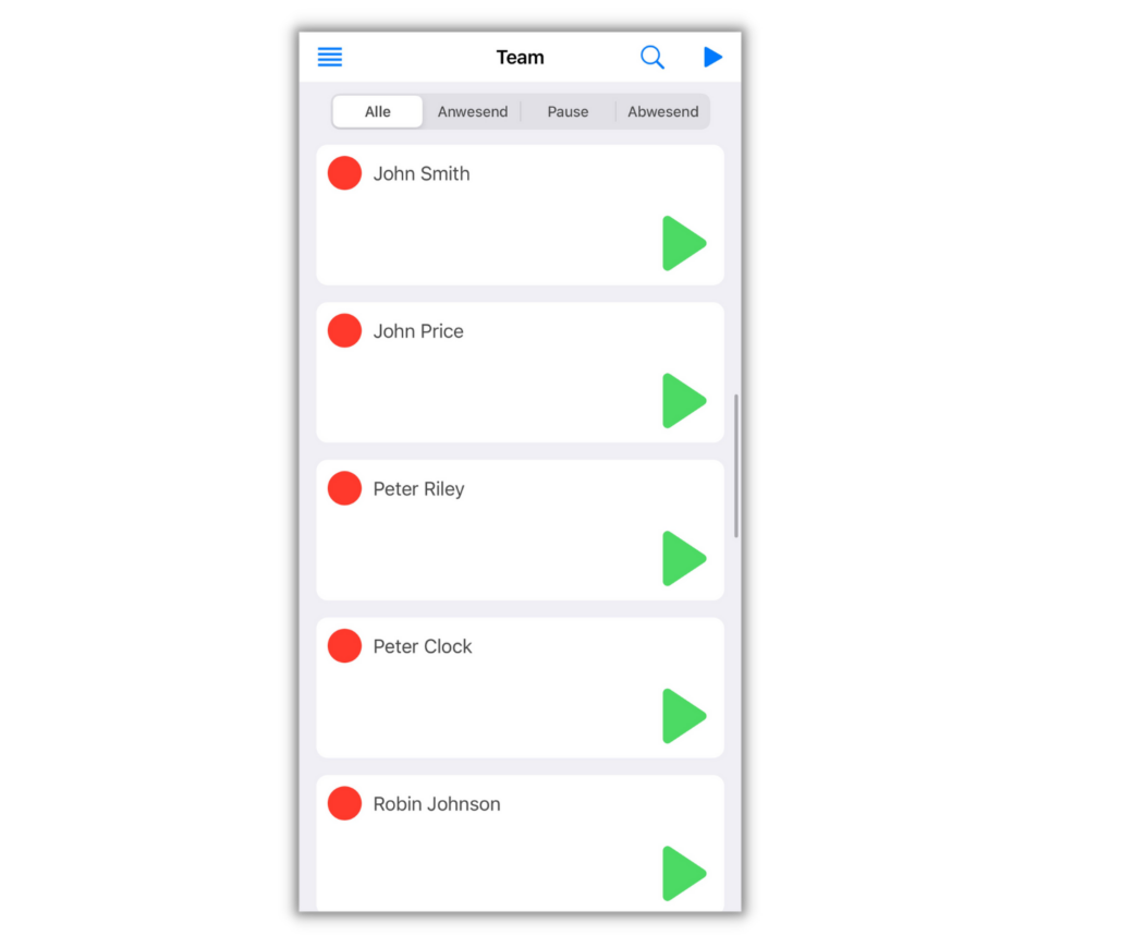 Administratoren und Teamleiter haben zusätzlich Zugriff auf den Team–Menüpunkt. Dort werden entweder alle Benutzer oder Benutzer aus dem eigenen Team angezeigt, deren Stempeluhrstatus überprüft werden kann. Sie können die Stempeluhr starten oder stoppen, abwesende Benutzer kontrollieren oder Benutzer sehen, die sich gerade in der Pause befinden.