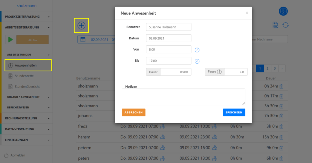 Auf der Seite Anwesenheiten können Sie Ihre Stunden durch das “Plus” nachtragen. Einfach Datum, Von – Bis eintragen sowie die Pausenzeit an diesem Tag und bei Bedarf auch eine Notiz (zB. Grund der Nachtragung)
