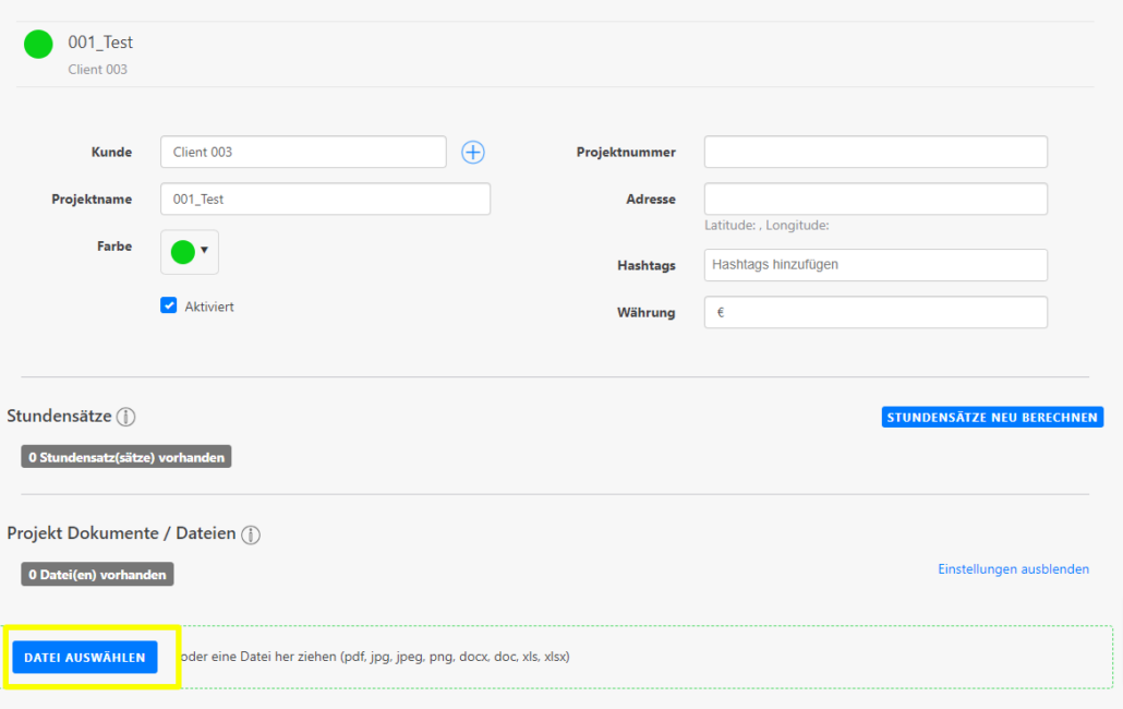 Um die Einstellungen eines Projekts zu ändern, klicken Sie unter Datenverwaltung > Projekte auf das Projekt. Sie können eine/n zusätzliche/n Kunden bzw. Kundin hinzufügen oder den Projektnamen ändern. Unter anderem können Sie eine Projektnummer und Adresse hinterlegen, und Hashtags definieren. Falls sich die Währung von dem Projekt von der im System hinterlegten Währung unterscheidet, können Sie dies ebenfalls eintragen.