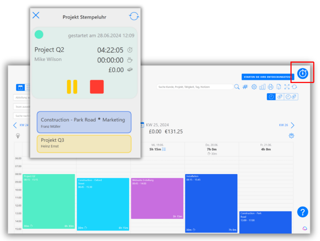 Die Projekt-Stempeluhr von TimeTrack ermöglicht Ihnen die minutengenaue Erfassung der Arbeitszeiten. Sie können diese Zeiten einem Kunden, einem Projekt und einer Tätigkeit zuordnen. Mit nur zwei Klicks erfassen Projektmitarbeiter den Beginn und das Ende ihrer Arbeit. Nach Abschluss einer Tätigkeit erscheint der Zeiteintrag in der Wochenansicht. Die zuletzt verwendeten Projekte werden vorgeschlagen.