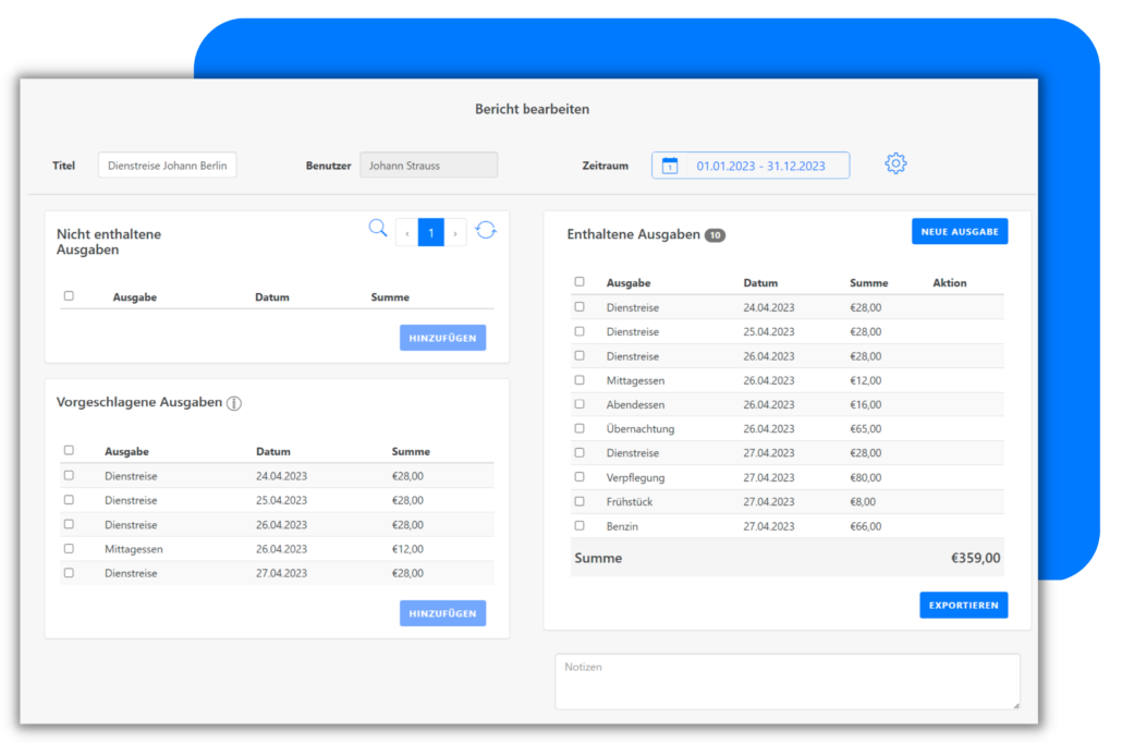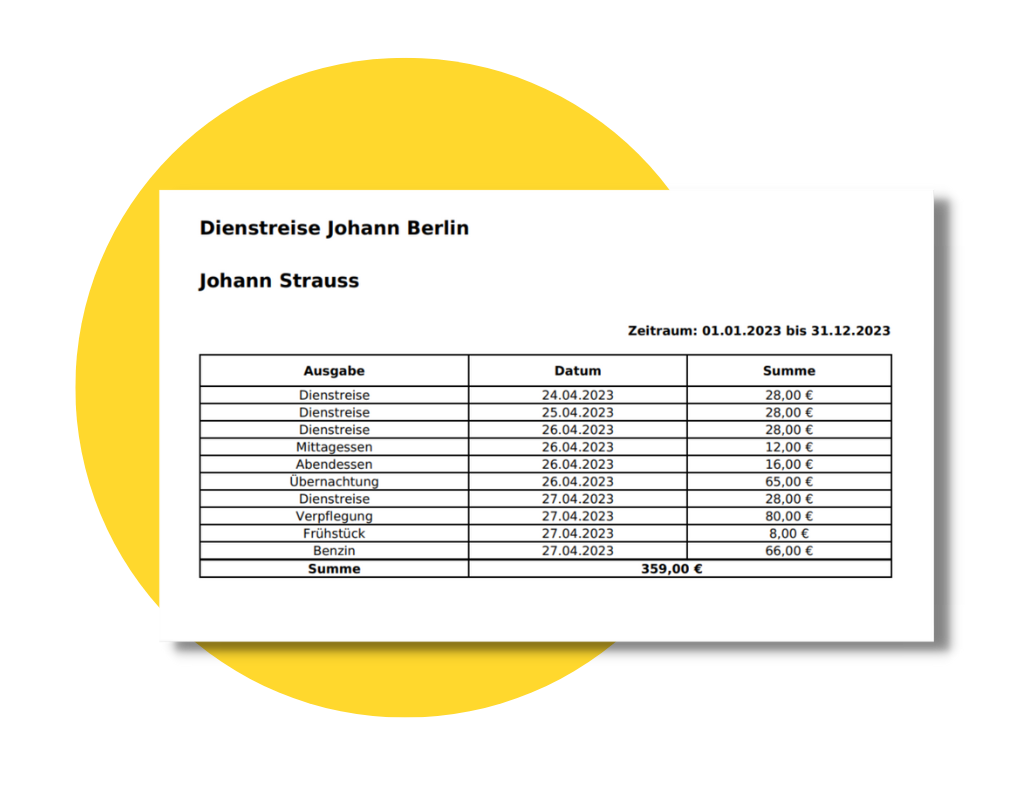 Dieser Bericht kann als PDF oder Excel exportiert und weitergeleitet werden. Die eingespeicherten Belege für Spesen können auch exportiert werden.
