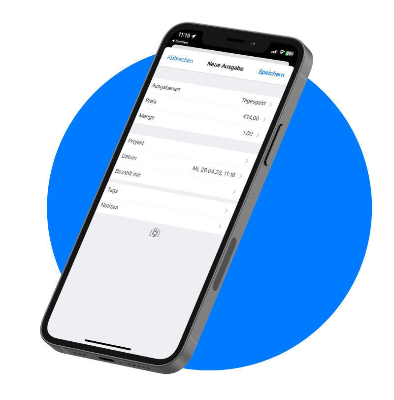 Egal, wo sich die Mitarbeiter gerade befinden: Sie können ganz einfach mit dem Smartphone eine Ausgabe erstellen, den bezahlten Betrag eingeben und ein Foto der Rechnung machen.