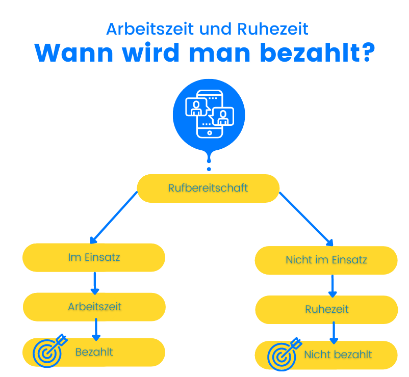 Bei der Rufbereitschaft unterscheidet man zwischen der Arbeitszeit und der Ruhezeit. Falls in der Rufbereitschaft die Dienste des Mitarbeiters bzw. der Mitarbeiterin nicht benötigt wurden, zählt diese Zeit als Ruhezeit. Da Ruhezeiten normalerweise nicht bezahlt werden und Rufbereitschaften bei nicht entsprechender Bezahlung für Arbeitnehmer:innen unattraktiv sind, wird meistens eine Pauschale festgelegt. Je nach Arbeitsvertrag variieren die Höhe der Bezahlung.