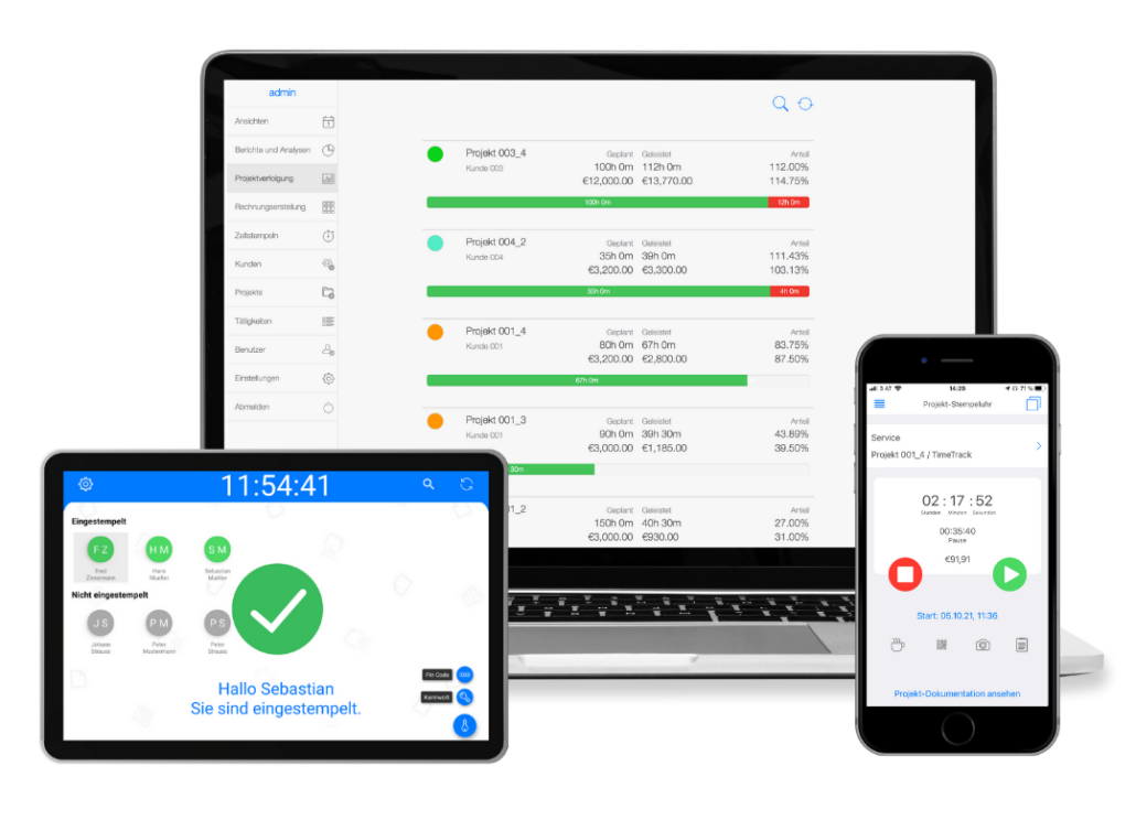 TimeTrack erlaubt es Unternehmen einfach und von überall ihre Arbeits- und Projektzeiten zu erfassen. Dank der automatisch erstellen Stundenzettel und Projektauswertungen behält man stets den Überblick über die geleistete Arbeit. Dank der innovativen Stempeluhr ist die Zeiterfassung sehr unkompliziert und genau, wodurch sie Ihre Aufmerksamkeit wichtigeren Aufgaben zuwenden können.