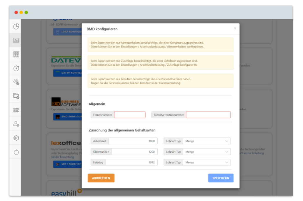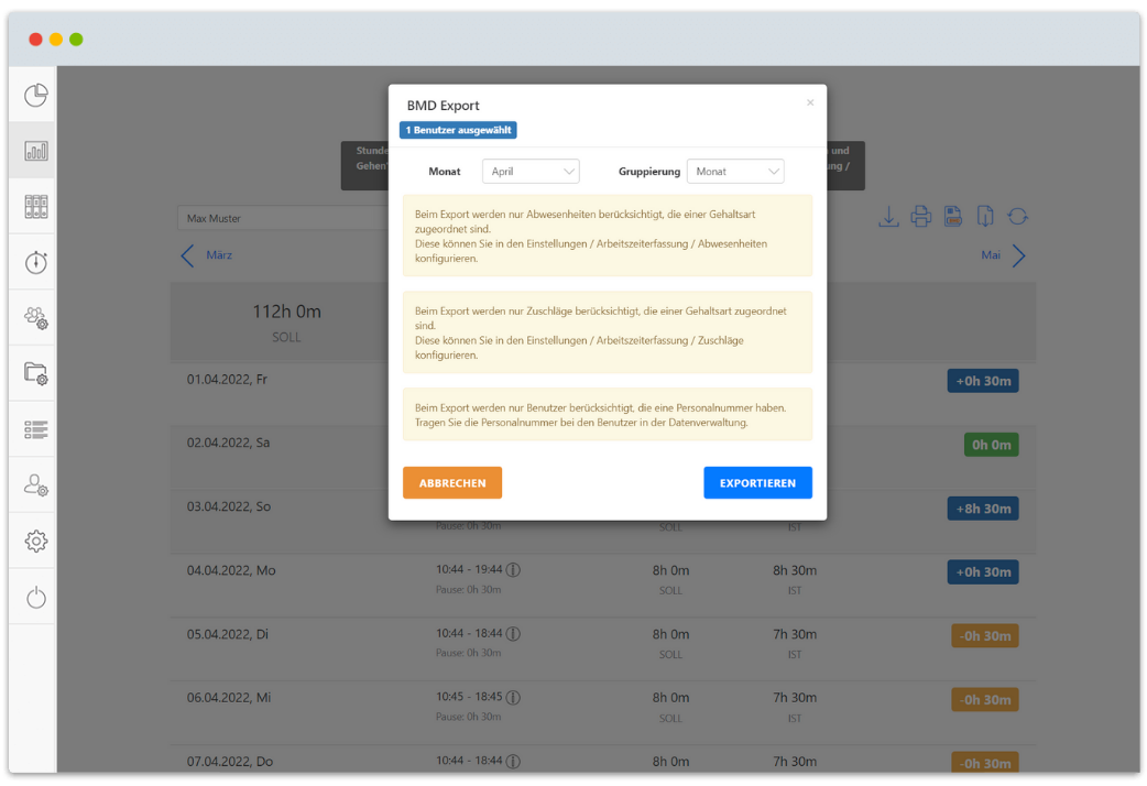 Bitte beachten Sie, dass beim Export nur Abwesenheiten und Zuschläge berücksichtigt werden, die einer Gehaltsart zugewiesen sind. Alle Benutzer, die exportiert werden sollen, müssen außerdem über eine Personalnummer verfügen.