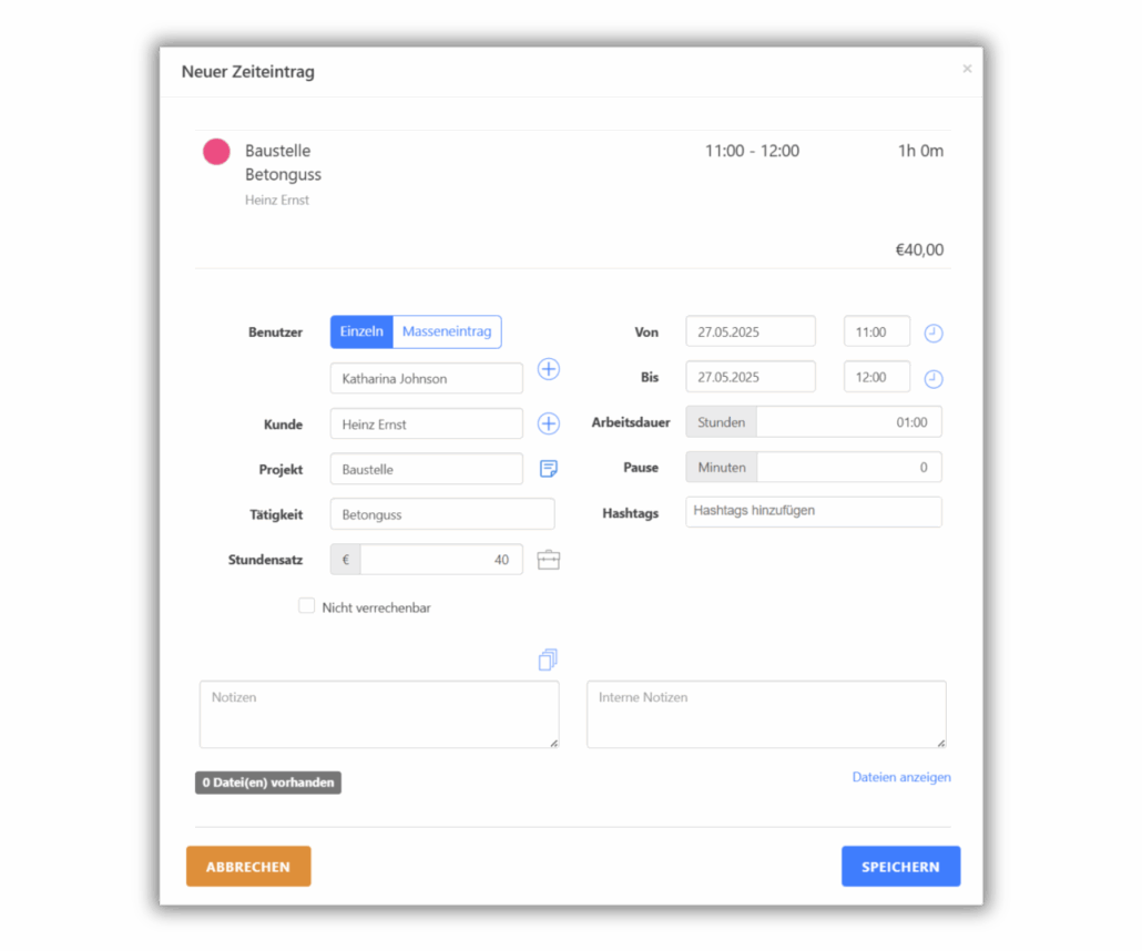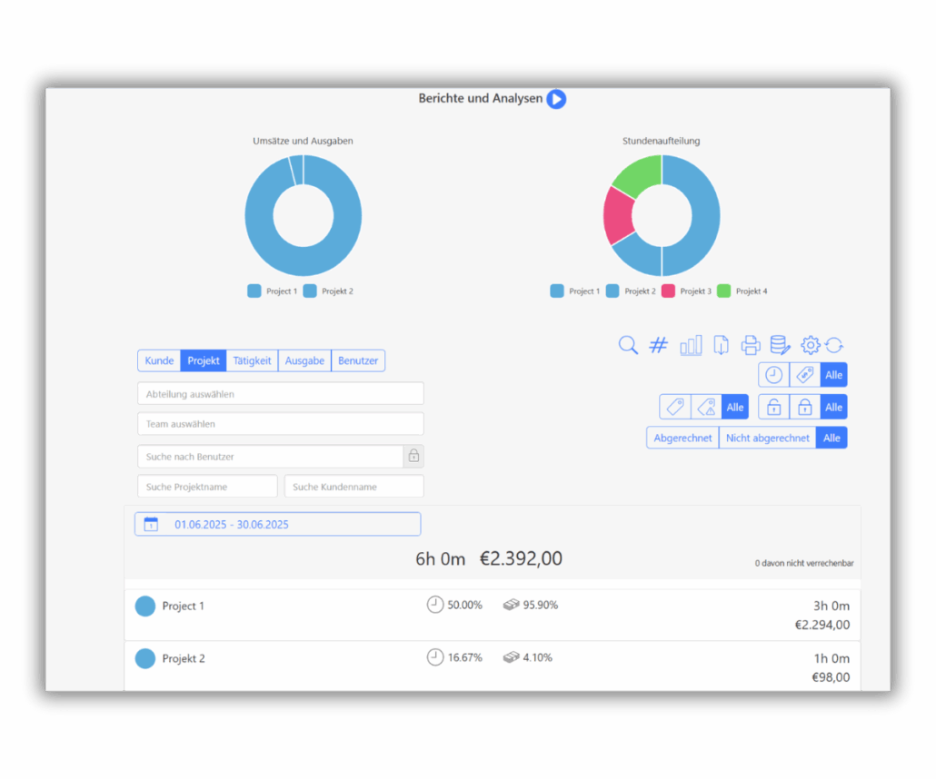 TimeTrack hilft Ihnen dabei ganz einfach Ihre Arbeits- und Projektzeiten zu erfassen. Jeder Zeiteintrag kann auf einen Kunden, ein Projekt und/ oder eine Tätigkeit verbucht werden. Dadurch können Sie laufend verfolgen wofür Sie Ihre Arbeitszeit investieren. Vereinfacht können Sie Ihre Arbeitszeit auch per Stempeluhr erfassen – bloß die Uhr laufen lassen, währenddessen voll und ganz auf Ihre Aufgaben konzentrieren. Außerdem können alle Ausgaben, die im Laufe eines Projektes anfallen (Material, Spesen, Kilometergeld), mit nur ein paar Klicks erfasst und später zur Rechnung hinzufügt werden.