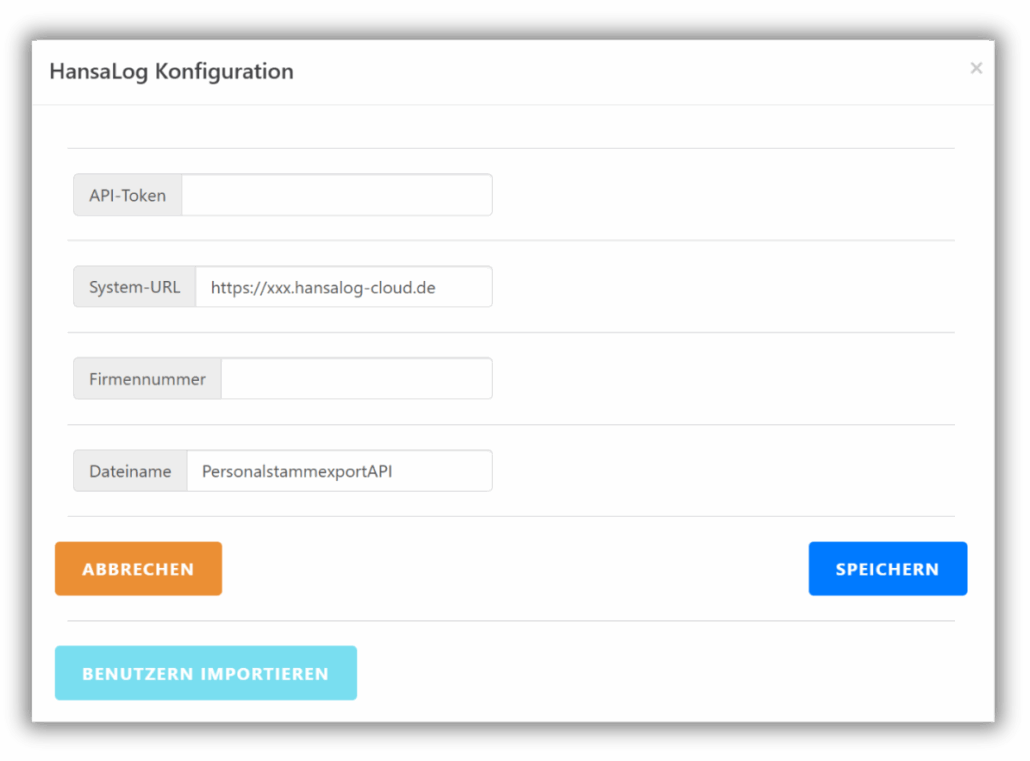 2. Klicken Sie auf „HansaLog konfigurieren“ . Geben Sie die Daten (API Token, System URL und Firmennummer) ein.