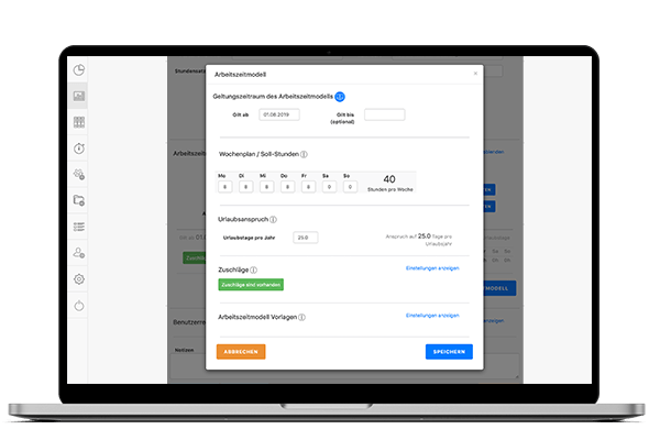 Der Urlaubsanspruch wird immer abhängig vom aktuellen Arbeitszeitmodell berechnet. Wenn Mitarbeiter an Feiertagen oder am Wochenende arbeiten, können auch Zuschläge im Arbeitszeitmodell angelegt und hinzugefügt werden.