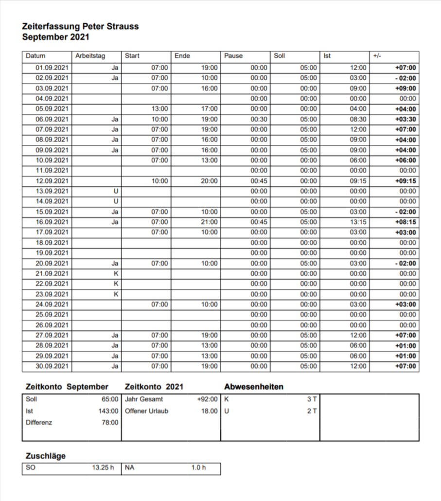 Voilà: ein fertiger One-Pager, mit dem Sie sofort alle An- und Abwesenheiten, Überstunden sowie Zuschläge im PDF Format einsehen können. So müssen Sie nicht mehr mit einer Stundenzettel Vorlage arbeiten.
