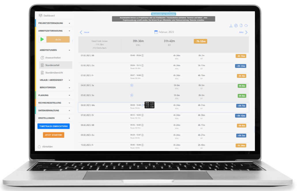 Mit der Online Stundenzettel App können Mitarbeiter ganz einfach ihre Arbeitszeiten überblicken und verwalten. Zudem werden die Ist- und Soll-Stunden angezeigt, damit der Überblick über die Überstunden nicht verloren geht. Auch Pausen werden angezeigt, um sicher zu stellen, dass sie richtig eingehalten werden. Der Stundenzettel geht über reine Anwesenheiten hinaus.
