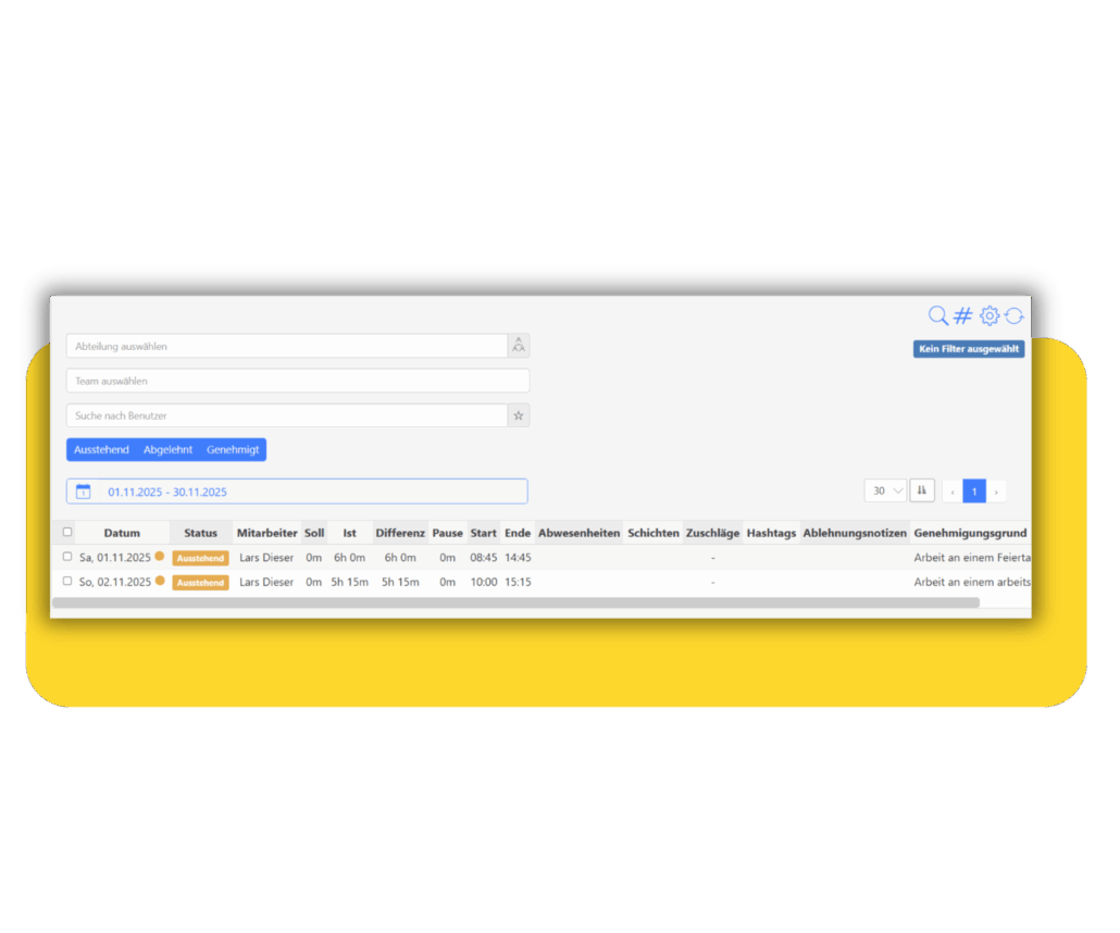 Der integrierte Genehmigungsprozess ermöglicht eine klare und nachvollziehbare Prüfung aller eingereichten Zeiten und Ausgaben. Projektleiter oder ein definierter Genehmiger können Arbeitsstunden bestätigen oder inklusive Begründung ablehnen. Flexible Genehmigungsregeln sorgen dafür, dass z. B. bis zu 40 Stunden pro Woche automatisch freigegeben werden, während darüber hinausgehende Einträge eine explizite Bestätigung erfordern.