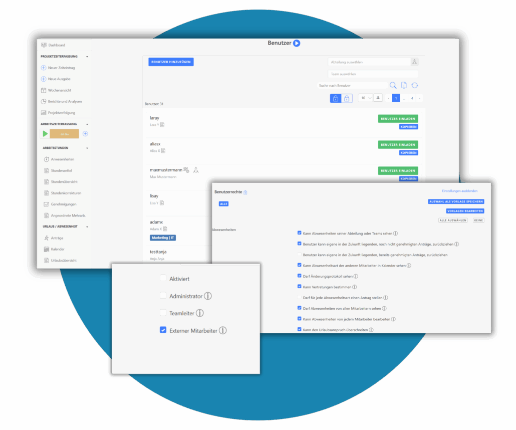 Mit TimeTrack erfassen externe Mitarbeiter (freie Mitarbeiter, Freelancer, Agenturmitarbeitende oder Praktikanten) ihre Projektzeiten und Ausgaben direkt im System. Durch die klare Abgrenzung von internen/externen Nutzer, Tätigkeiten sowie transparente Dokumentation reduziert TimeTrack zusätzlich Missklassifizierungsrisiken (Scheinselbstständigkeit). Die automatisch generierten Leistungsnachweise liefern eine vollständige, revisionssichere Dokumentation aller geleisteten Arbeitsstunden und entstandenen Kosten. Die exakte Performance-Erfassung unterstützt Unternehmen dabei, vertragliche Vereinbarungen einzuhalten und Compliance-Anforderungen zu erfüllen.