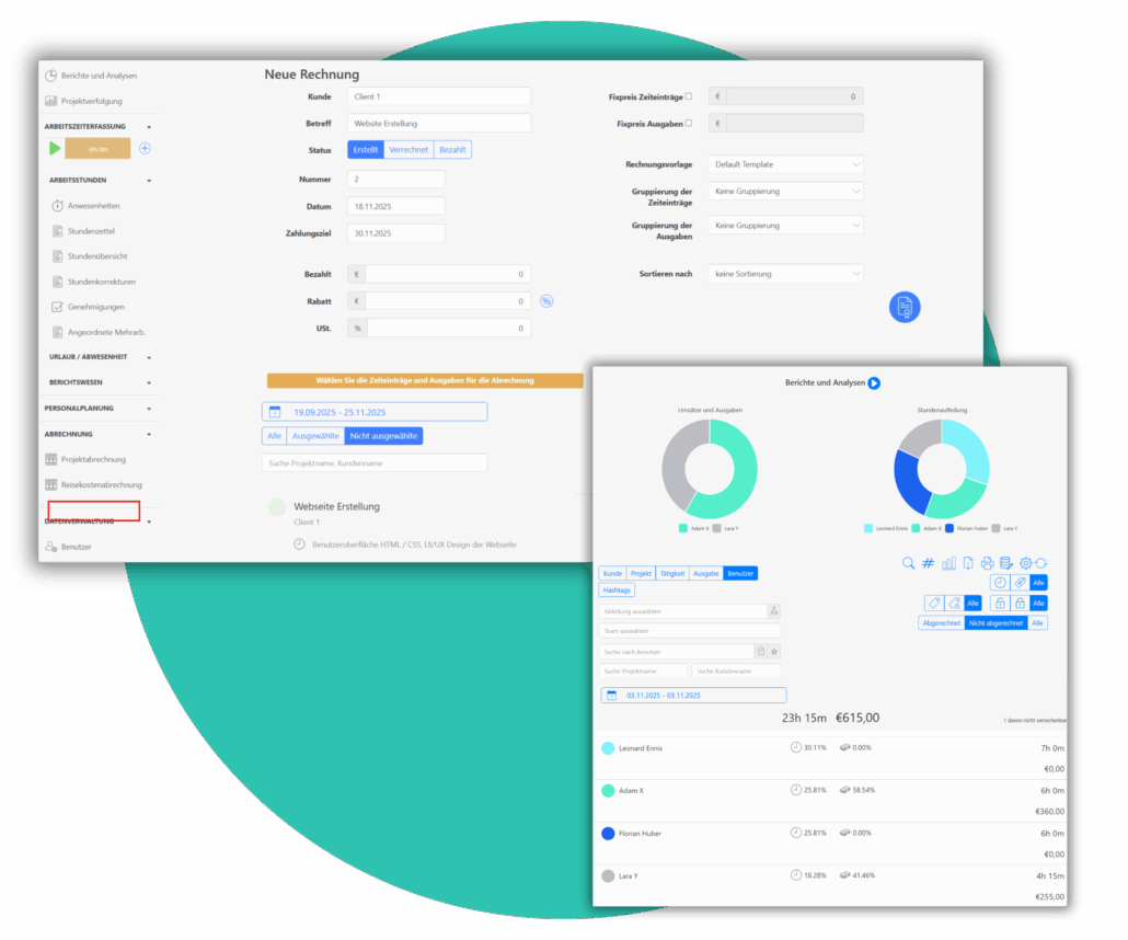 Alle bestätigten Stunden und Ausgaben werden automatisch in den Leistungsnachweis eingebunden und können direkt zur Rechnungserstellung genutzt werden. Externe Mitarbeiter können ihre Rechnungen mit nur wenigen Klicks mit ihren erfassten Zeiten abgleichen.