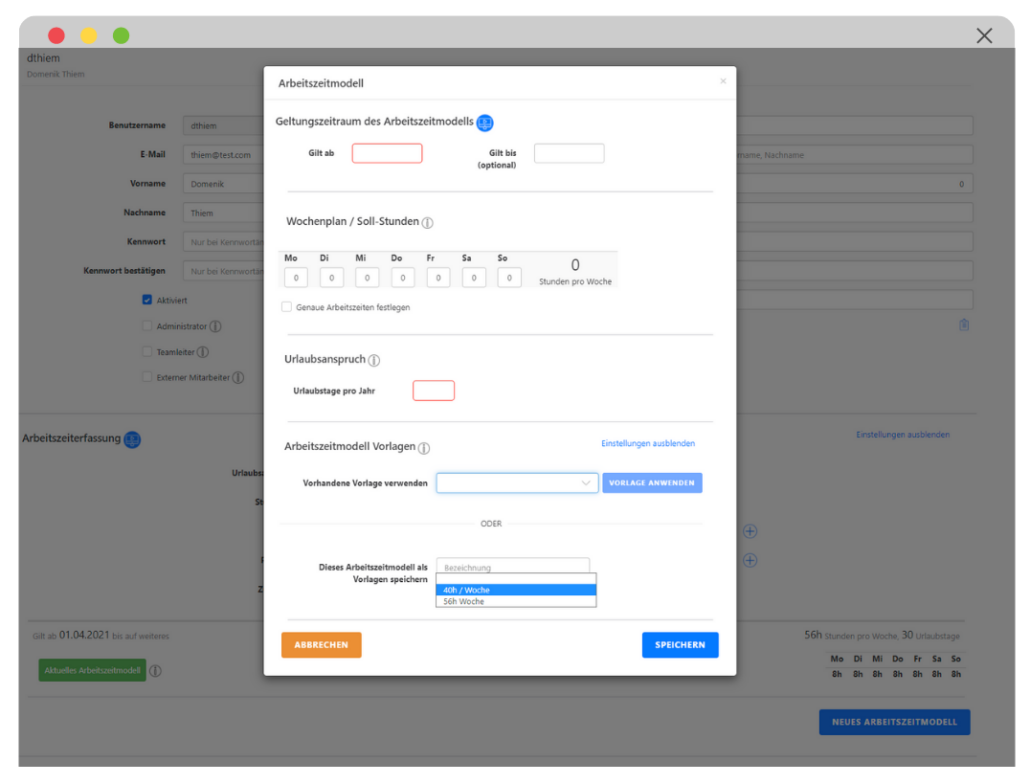 Um Ihnen Zeit zu sparen, bietet TimeTrack eine breite Auswahl an automatische Vorlagen, wie zum Beispiel für Arbeitszeitmodelle, Pausenregelungen oder Feiertage. Falls Sie Ihre Angaben personalisieren wollen, können Sie diese für Ihr großes Unternehmen natürlich auch selbst definieren.
