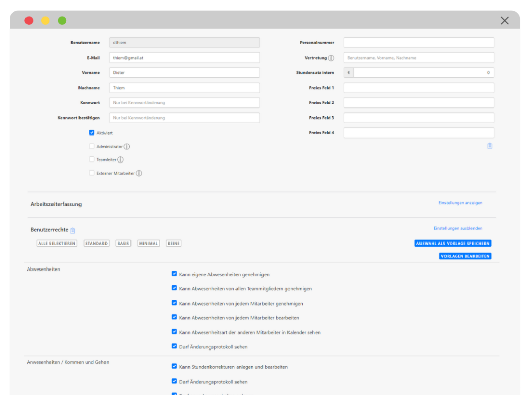 Weisen Sie Ihren Mitarbeiter nur die notwendigsten Berechtigungen zu, um Unklarheiten zu vermeiden. Sie können die Benutzerrechte entweder manuell oder mittels Vorlagen, welche sie auch selbst anlegen können, bestimmen.