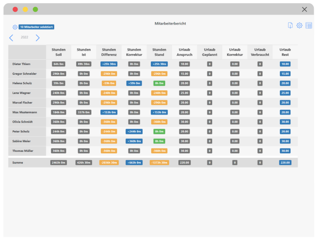 Mit dem Berichtswesen, welches sowohl über einen Stundenbericht, Anwesenheitsbericht und Zuschlagsbericht verfügt, überblicken Sie alle wichtigen Informationen Ihrer Mitarbeiter. Sie erfassen nicht nur ihre Soll- und Ist-Stunden, sondern auch Ihre Abwesenheiten, ihren restlichen Urlaub und ausstehende Zuschläge.